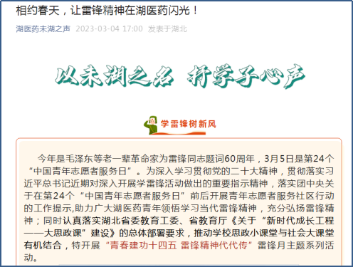 在“雷锋日”到来前夕,英国365集团向广大师生发出《相约春天,让雷锋精神在湖医药闪光!》的号召。