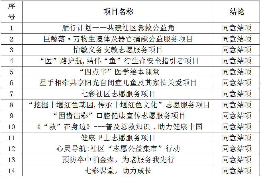 由于2022年受疫情影响,2022和2023年两届志愿服务项目大赛中所立项支持的项目均于2023年11月开展结项验收。校团委、校青协牵头对所有申请结项项目材料进行核查、验收后,将验收结果通知如下: