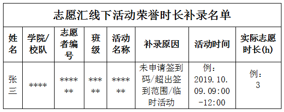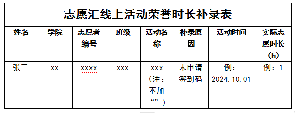 3.活动结束后需按照模板收集参加活动志愿者的相关信息(文件名称统一为“举办方+活动主题+线上活动荣誉时长补录表”),于活动结束后3天内提交至校青协网络文明部,三天内未提交补录表的活动不进行补录。所有线上活动荣誉时长将统一在月末或下一月月初进行公示以及补录。模板如下所示: