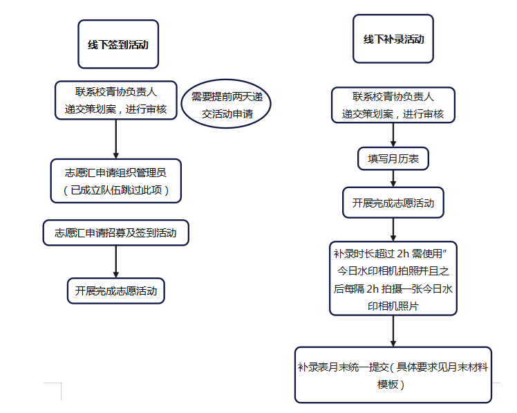 1.除寒暑假校外志愿活动,学期内开展线下活动皆应以志愿汇签到签退形式记录时长。如有特殊情况未使用签到码进行签到,需由活动负责人进行时长统计并交由校青协说明缘由,申请统一补录。